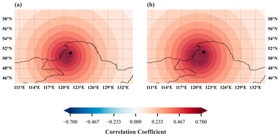 Spatial correlation between model-reconstructed NPP series and MODIS NPP series: (a) spatial correlation between ERF-reconstructed NPP and MODIS NPP series; (b) spatial correlation between XGBoost-reconstructed NPP and MODIS NPP series. The pentagram indicates the approximate position of the study region.