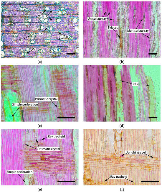 Sections of xylem in Cercis glabra: (a) cross-section, wood was semi-ring-porous with vessels being solitary (V1), radial multiples (V2), and clustered (V3), axial parenchyma (P) in paratracheal-zonate, ray (R), fiber (F); (b) tangential section, tyloses in vessels, multiseriate and uniseriate rays; (c) radial section, simple perforation of vessel elements; (d) tangential section, simple and alternates pits on the vessel wall; (e) radial section, prismatic crystals in the axial parenchyma cells, ray tracheids, simple perforation of vessel elements; (f) radial section, prismatic crystals in the axial parenchyma cells, upright ray cells. The scale bar represents 100 µm.