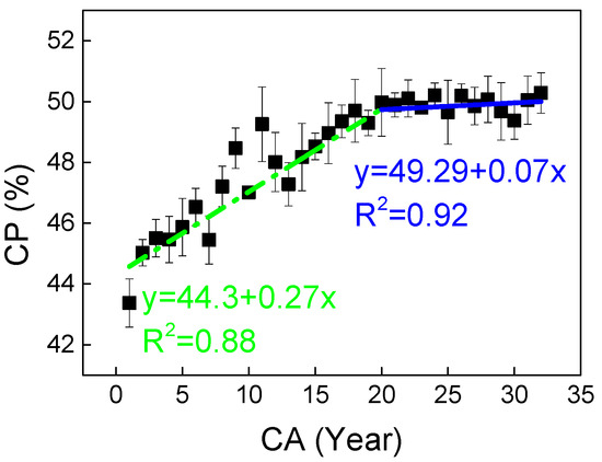 The cell wall percentage (CP) of C. glabra wood shows a distinct radial growth pattern, increasing progressively from pith to bark with a notable inflection point at 20 years (Figure 2). Linear piecewise regression reveals accelerated CP accumulation before this transition (R2 = 0.88), followed by a more gradual increase in mature wood (R2 = 0.92). Statistical analysis confirms a significant difference between juvenile (≈47% CP) and mature wood (≈50% CP), with a mean difference of 3% (p < 0.05, Table 2). This developmental shift mirrors the species’ transition from early structural establishment to later stabilization of wood properties.