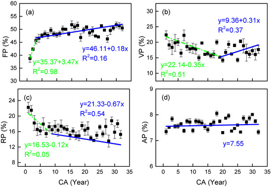 Observed (mean) and two segment-fitted tissue proportion trends vs. cambial age (CA) in Cercis glabra wood. Bars show standard error. Green, dash-dot lines represent the first segment (juvenile wood). Blue, solid lines represent the second segment (mature wood). (a) FP represents the fiber proportion; (b) VP represents the vessel proportion; (c) RP represents the ray proportion; (d) AP is the axial parenchyma tissue proportion. Confidence interval: 95%.