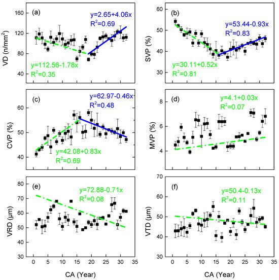 Observed (mean) and two segment-fitted vessel characteristics trends vs. cambial age (CA) in Cercis glabra wood. Bars show standard error. Green, dash-dot lines represent the first segment (juvenile wood). Blue, solid lines represent the second segment (mature wood). (a) VD represents the vessel density; (b) SVP represents the percentage of solitary vessels to all vessels; (c) CVP represents the percentage of clustered vessels to all vessels; (d) MVP represents the percentage of multiple vessels to all vessels; (e) VRD represents the vessel lumen radial diameter; (f) VTD is the vessel lumen tangential diameter. Confidence interval: 95%.