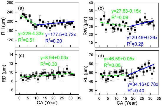 Observed (mean) and two segment-fitted vessel characteristics trends vs. cambial age (CA) in Cercis glabra wood. Bars show standard error. Green, dash-dot lines represent the first segment (juvenile wood). Blue, solid lines represent the second segment (mature wood). (a) RH represents the ray height; (b) RW represents the ray width; (c) RD represents the parenchyma cell lumen diameter; (d) RL is the parenchyma cell length. Confidence interval: 95%.