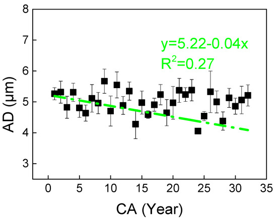 AD exhibits a gradual decreasing trend from pith to bark with increasing CA, though the linear regression shows limited fitting accuracy (R2 = 0.27) without a distinct inflection point (Figure 7).