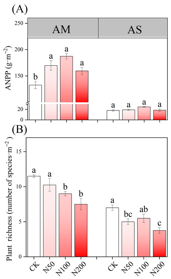 Effects of N additions on plant ANPP (A) and species richness (B) in AM and AS. Different lowercase letters represent significant differences among treatments in the same grass-land at the 0.05 level.