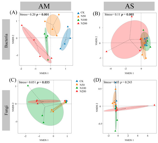 Nonmetric multidimensional scaling based on Bray–Curtis distance of bacterial in AM (A) and AS (B), and fungal in AM (C) and AS (D).