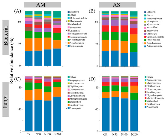 Differences in the top ten taxa at phylum level for soil bacteria in AM (A) and AS (B), fungi in AM (C) and AS (D). Significance level: * p < 0.05.