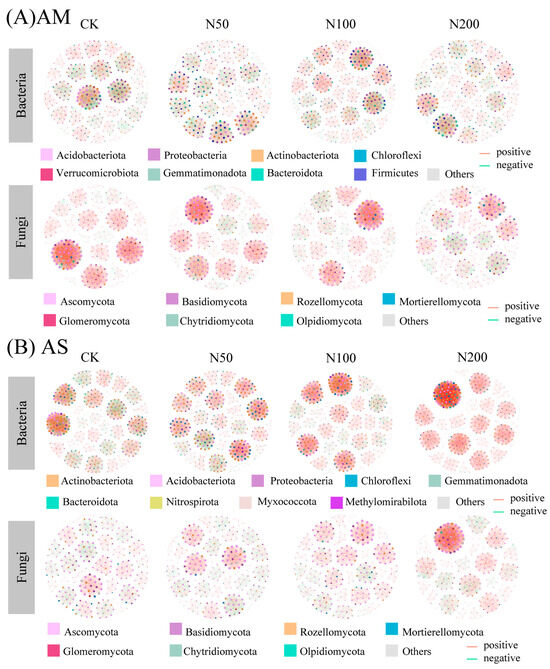 In AS, the number of bacterial nodes showed a decreasing trend with increasing N input, declining from 431 in CK to 394 in N200. Notably, the number of edges increased significantly in the N200, primarily driven by a sharp rise in positive edges despite a drastic decline in negative edges. Consequently, the average degree of bacterial nodes increased significantly under N200 (21.85 vs. 27.98), indicating a more tightly connected network. Meanwhile, network density increased slightly from 0.05 to 0.07, and modularity declined from 0.90 to 0.78, suggesting a less compartmentalized network. In contrast, fungal networks in AS exhibited an increase in both node and edge numbers. Positive and negative edges showed opposite trends: positive edges increased while negative edges decreased. Average degree and density of fungal networks also increased. Consistent with bacterial networks, fungal network modularity decreased from 0.94 in CK to 0.80 in N200 (Figure 4B and Table 3).