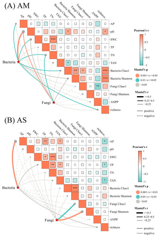 Mantel-test results revealed that in AM, soil bacterial and fungal community composition were significantly associated with soil pH and TN. Additionally, soil AP, SWC, and plant richness showed significantly positive correlation with bacterial community composition. In AS, soil bacterial communities are mainly associated with soil AP (Figure 5A,B). However, ANPP exhibited no impacts on microbial community composition in both types of grasslands.