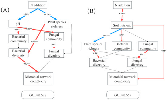 Partial least squares path modeling analysis (PLS-PM) showing the direct and indirect effects of N additions on microbial network complexity in AM (A) and AS (B). Soil nutrient (TP, TN, AP, TAN), the bacterial community (the relative abundance of bacteria at the phylum level), the fungal community (the relative abundance of fungi at the phylum level), bacterial diversity (Chao 1 and Shannon index of bacteria), fungal diversity (Chao 1 and Shannon index of fungi), microbial network complexity (nodes, edges, positive edges, negative edges, average degree, density, and modularity). The red and blue arrows represent positive and negative pathways, respectively, and solid and dashed lines show significant and non-significant pathways, respectively. The thickness of the arrows indicated the strength of the relationship. Significance level: * p < 0.05, ** p < 0.01, *** p < 0.001.
