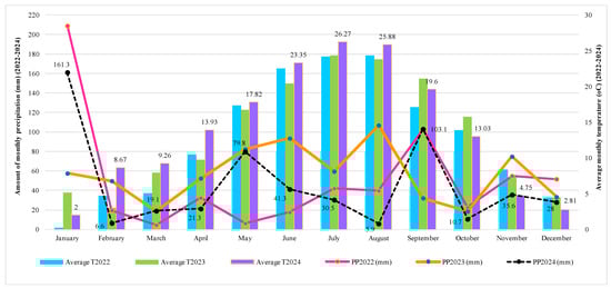 Temperature and precipitation in Timisoara area, Romania (2022–2024). (Average T2022, Average T2023, and Average T2024 → These refer to the mean air temperatures recorded during the growing seasons of 2022, 2023, and 2024, respectively. PP2022 (mm), PP2023 (mm), and PP2024 (mm) → These represent the total precipitation (rainfall) amounts, expressed in millimeters (mm), for the same years (2022–2024).