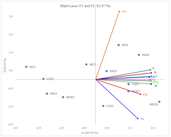 Principal component analysis (PCA) biplot of sap mineral composition across cultivars and years. (Blue points represent cultivar–year combinations (CS = ‘Cabernet Sauvignon’, PN = ‘Pinot Noir’, M = ‘Merlot’, MO = ‘Muscat Ottonel’; followed by the year: 22 = 2022, 23 = 2023, 24 = 2024). Colored vectors indicate mineral compound loadings: molybdenum (Mo, orange), potassium (K, navy blue), boron (B, burgundy), calcium (Ca, green), manganese (Mn, blue dots), sulphur (S, electric pink), phosphorus (P, purple), magnesium (Mg, electric green dots), zinc (Zn, grey), nitrogen (N, black), copper (Cu, red), and iron (Fe, blue). The direction and length of each vector represent the contribution and correlation of that mineral to the first two principal components. Cultivar–year points positioned in the direction of a given vector are more strongly associated with higher concentrations of that mineral.