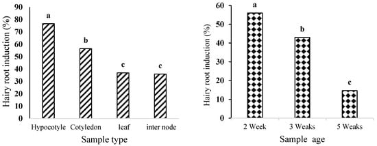 2.2. The Effect of Explant Type and Age on Hairy Root Induction