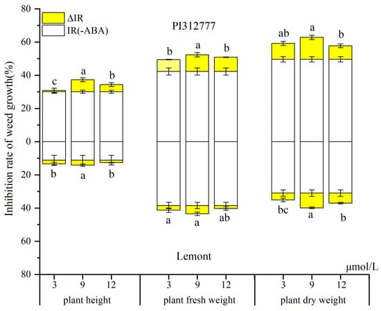 Inhibition of barnyard grass growth by PI and Le rice under induction treatment with exogenous ABA at different concentrations. IR, the % inhibition without ABA induction, ΔIR, increment of the % inhibition with ABA induction. Values plotted are means plus/minus SE. Significant differences (p < 0.05) between ABA treatments within the same rice cultivars are indicated by different lowercase letters.