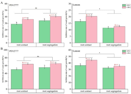 Effect of exogenous ABA on the inhibition of plant height (A) and plant dry weight (B) of barnyard grass mix-cultured with two rice cultivars during root contact or root segregation with nylon mesh. Values plotted are means plus/minus SE. Different letters above the bars represent significant differences between ABA treatments within the same root treatment (p < 0.05, t-test). The numbers with red arrows represent the increase in inhibition rate induced by ABA within the same root treatment group. Asterisks indicate significant differences between the root treatments. ns, not significant (two-way ANOVA, * p < 0.05).
