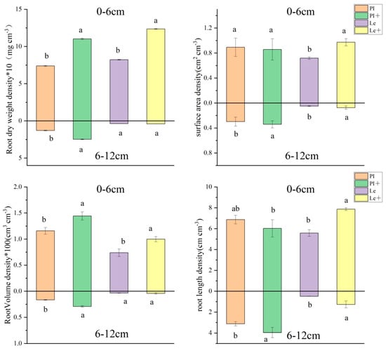 Effect of exogenous ABA on the distribution of rice roots in different soil layers. PI: PI without ABA treatment, PI+: PI with ABA induction, and Le: Le without ABA treatment, Le+: Le with ABA induction. Values plotted are means plus/minus SE. Significant differences (p < 0.05) between ABA treatments at the same distance are indicated by different lowercase letters.