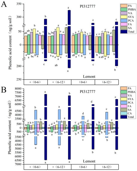 When two rice seedlings were exposed to exogenous ABA, the trends of change in the content of each individual phenolic acid (salicylic acid, vanillic acid, syringic acid, protocatechuic acid, p-hydroxybenzoic acid, p-coumaric acid, ferulic acid, and cinnamic acid) in different soil layers were not completely consistent, whether for reversibly adsorbed phenolic acid or irreversibly adsorbed phenolic acid (Figure 4). Due to the stronger weed-suppression effect of phenolic acid mixtures compared to each individual phenolic acid, we focused on the changes in total content of phenolic acids (the sum of eight phenolic acids). For the reversibly adsorbed phenolic acids which can be directly utilized by the weed or microorganisms (Figure 4A), the total amounts of reversibly adsorbed phenolic acids in the 0–6 cm and 6–12 cm soil layers of PI were 0.292 mg/g and 0.326 mg/g, respectively, which were significantly greater than those in the uninduced group, increasing by 5.68% and 15.7%, respectively. Nevertheless, ABA treatment resulted in no significant change in the total content of reversibly adsorbed phenolic acids in the two lateral distance soil layers of Le. Additionally, as shown in Figure 4B, the total contents of irreversibly adsorbed phenolic acids in the 0–6 cm and 6–12 cm soil layers of Le were 6.44 mg/g and 6.38 mg/g, respectively, which were significantly greater than those in the untreated control group, with increases of 27.1% and 24.5%, respectively. ABA treatment elevated the irreversibly adsorbed phenolic acids in the two soil layers of PI by 21.9% and 6.98%, respectively.