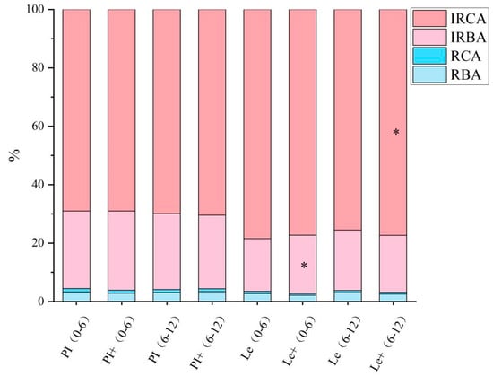 The proportion of different types of phenolic acids in rhizosphere soil of different soil layers of rice induced by exogenous ABA. The soil samples in the 0–6 and 6–12 cm soil layers of each rice cultivar without ABA induction are denoted as (0–6) and (6–12), respectively, while the root samples of the two rice cultivars induced by ABA are denoted as + (0–6) and + (6–12), respectively. RBA: reversibly adsorbed benzoic acid derivatives, RCA: reversibly adsorbed cinnamic acid derivatives, IRBA: irreversibly adsorbed benzoic acid derivatives; IRCA: irreversibly adsorbed cinnamic acid derivatives. Asterisks indicate significant differences between ABA treatments in the 0–6 and 6–12 cm soil layers of the same rice cultivar (* p < 0.05).