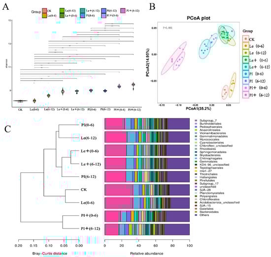 Modulation of the specific bacterial taxa in the 0–6 and 6–12 soil layers of PI and Le induced by exogenous ABA. The soil samples in the 0–6 and 6–12 cm soil layers of each rice cultivar without ABA induction are denoted as (0–6) and (6–12), respectively, while the root samples of the two rice cultivars induced by ABA are denoted as + (0–6) and + (6–12), respectively. CK, monocultures of the barnyard grass. (A) The Shannon index of the nine types of soil. ** indicates significant difference at p < 0.01 level. (B) Principal coordinate analysis (PCoA) of bacterial community of three types of soil based on Bray–Curtis distance. (C) Accumulation clustering map of order distribution of the rhizosphere microbiota compositions in the nine types of soil.