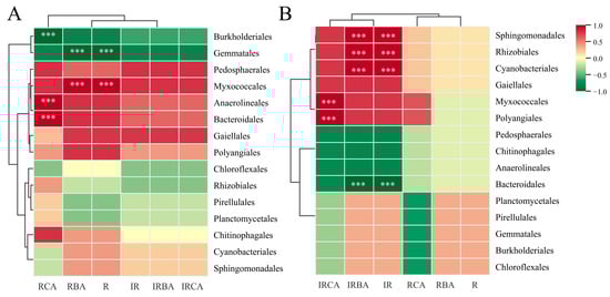 Spearman correlation analysis between bacterial communities and phenolic acids in the rhizosphere soil of PI (A) and Le (B) induced by exogenous ABA. R: Total reversibly adsorbed phenolic acid; IR: Total irreversibly adsorbed phenolic acid; RBA: reversibly adsorbed benzoic acid derivatives, RCA: reversibly adsorbed cinnamic acid derivatives, IRBA: irreversibly adsorbed benzoic acid derivatives; IRCA: irreversibly adsorbed cinnamic acid derivatives. In Spearman correlation analysis, the corresponding intermediate heat map value is the Spearman correlation coefficient r, r > 0 is the positive correlation, r < 0 is negative correlation. *** indicates the significance test p < 0.001.