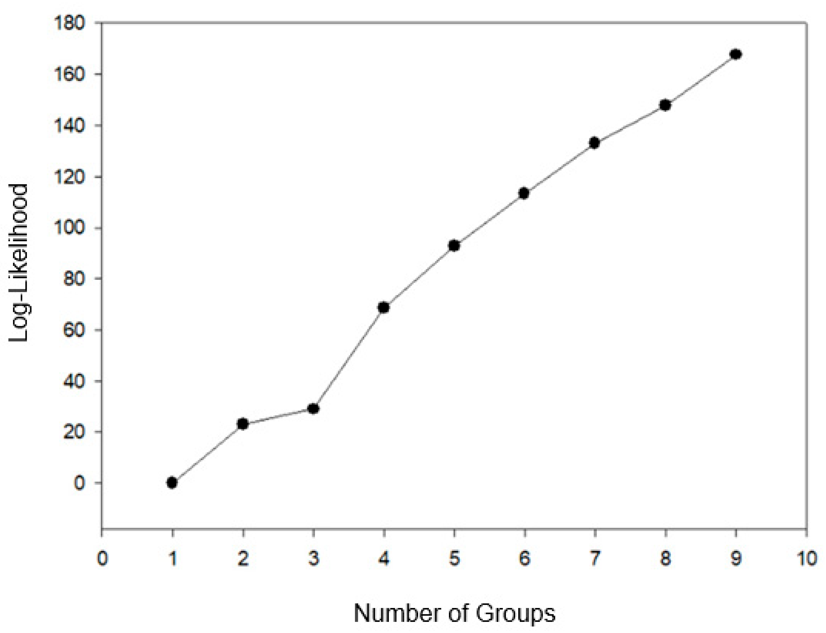 2 criteria, in combination with the likelihood profile, the ideal number of groups was determined to be four. This grouping corresponded to the point where the greatest increase in the logarithmic function occurred, with the highest absolute value observed in the fourth group (