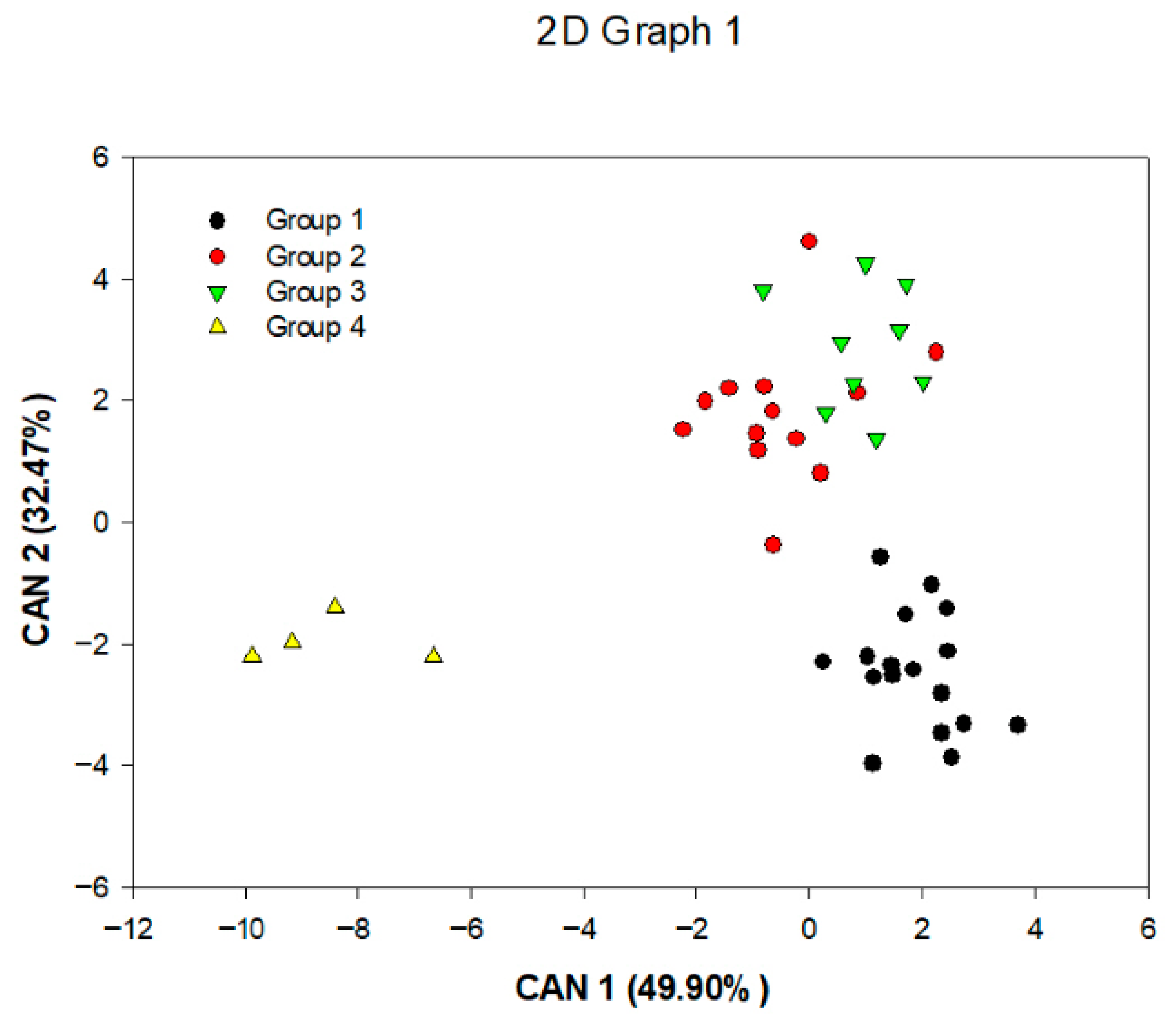 The first two canonical variables accounted for 82.37% of the total variance, allowing for a satisfactory explanation of the variability among