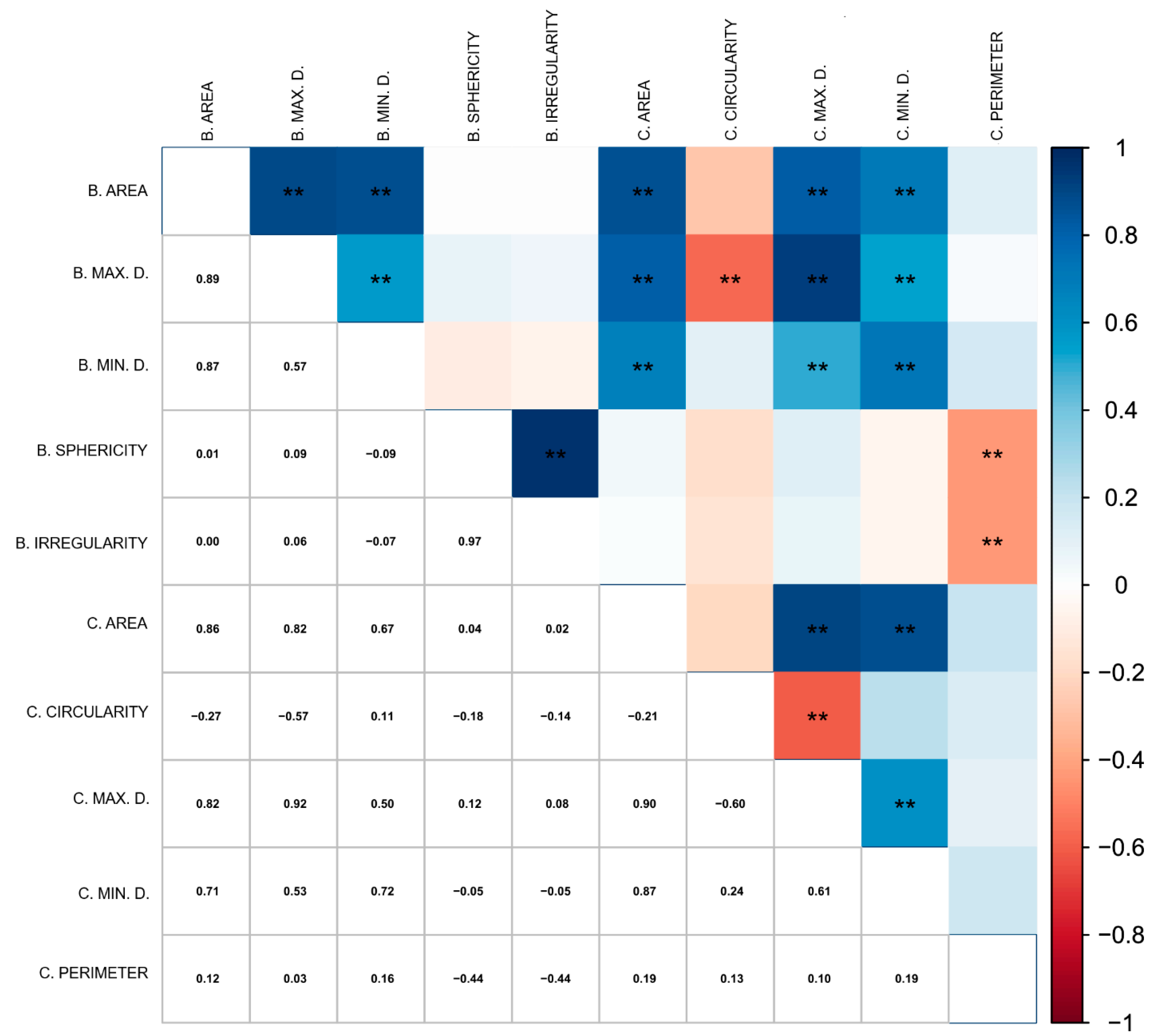 2), circularity (B. CIRCULARITY), maximum diameter (B. MAX D., cm), minimum diameter (B. MIN D., cm), sphericity (B. SPHERICITY), rectangularity (B. RECTANGULARITY), irregularity (B. IRREGULARITY), number of corners (B. N. CORNERS), and perimeter (B. PERIMETER, cm) [