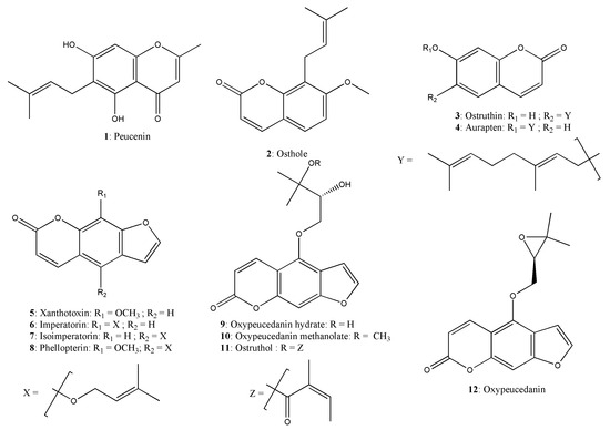 Exhaustive maceration, followed by repeated chromatographic separation led to the isolation of one prenylated chromone (1), three prenylated coumarins (2 to 4) and eight linear furanocoumarins (5 to 12) (Figure 2). After comparison of mass spectrometry (MS) and nuclear magnetic resonance (NMR) data, these compounds were identified as peucenin (1) [19], osthole (2) [20], ostruthin (3) [21], auraptene (4) [22], xanthotoxin (5) [23], imperatorin (6) [24], isoimperatorin (7) [25], phellopterin (8) [26], oxypeucedanin hydrate (9) [27], oxypeucedanin methanolate (10) [28], ostruthol (11) [29], and oxypeucedanin (12) [30]. To the best of our knowledge, phellopterin (8) and xanthotoxin (5) are reported here for the first time from P. ostruthium. NMR and MS data for these compounds are provided in the Supplementary Material.