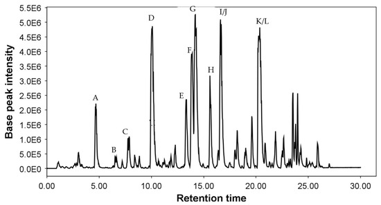Base peak chromatogram of P. ostruthium acetone extract. Peak A = oxypeucedanin hydrate (9), B = xanthotoxin (5), C = oxypeucedanin methanolate (10), D = oxypeucedanin (12), E = peucenin (1), F = ostruthol (11), G = imperatorin (6), H = phellopterin (8), I = isoimperatorin (7), J = osthole (2), K = ostruthin (3), L = auraptene (4).
