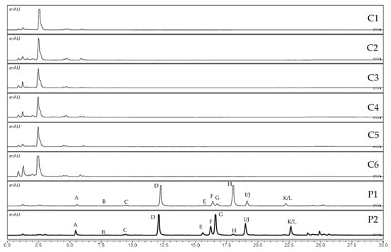 Comparison of UV chromatograms (254 nm) of acetone extracts from C. alpina accessions (C1–C6) and P. ostruthium samples (P1 and P2).