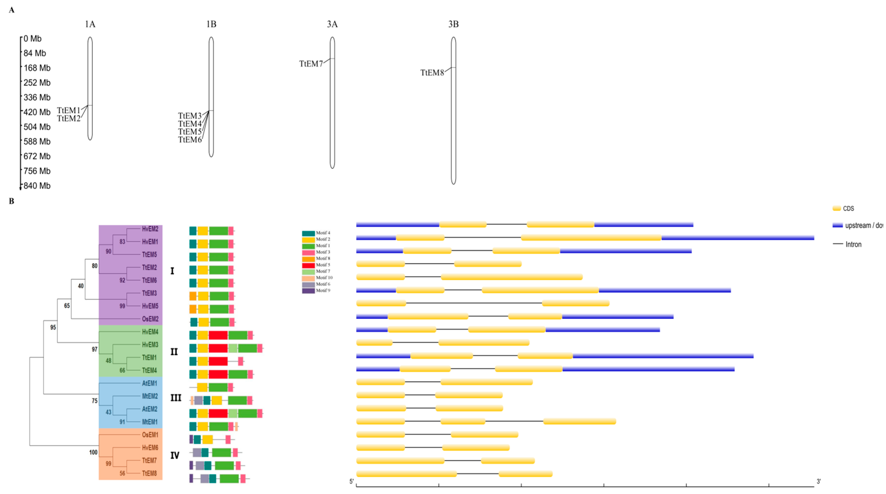 2.1. Identification and Characterization of TtEM (LEA_5) Genes in Durum Wheat