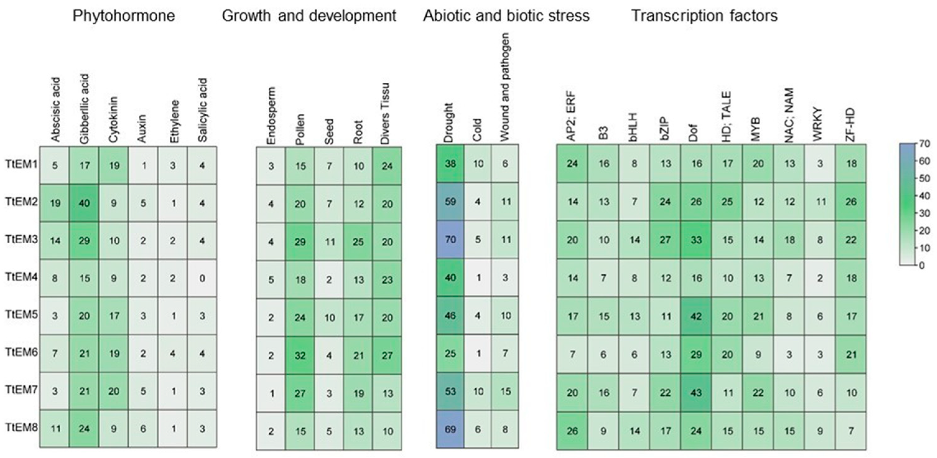 2.4. Analysis of Cis-Acting Elements in Promoters of TtEM Genes