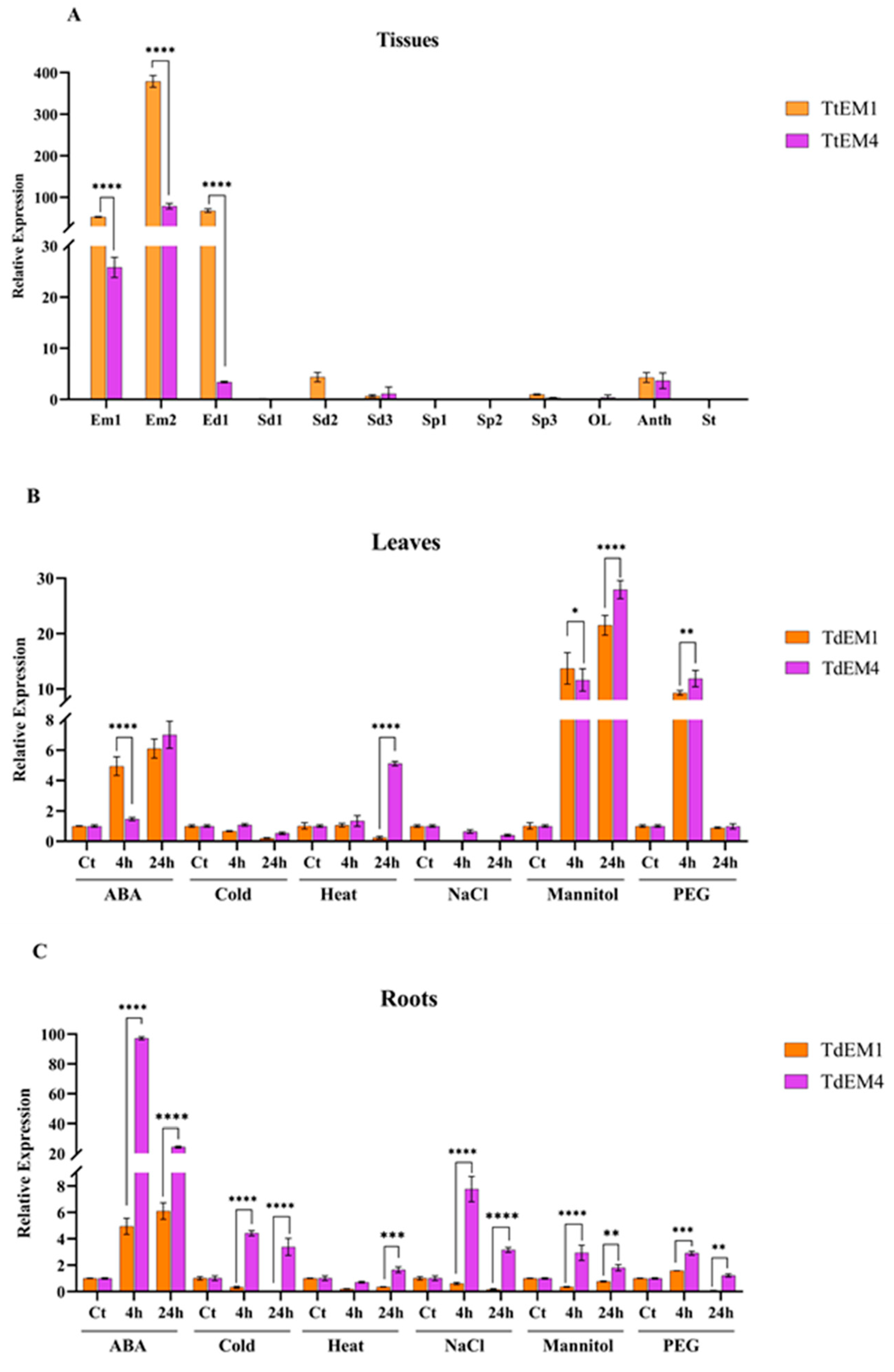 2.5. Expression Patterns of TtEM1 and TtEM4 Genes in Different Tissues and Under Stress Treatments