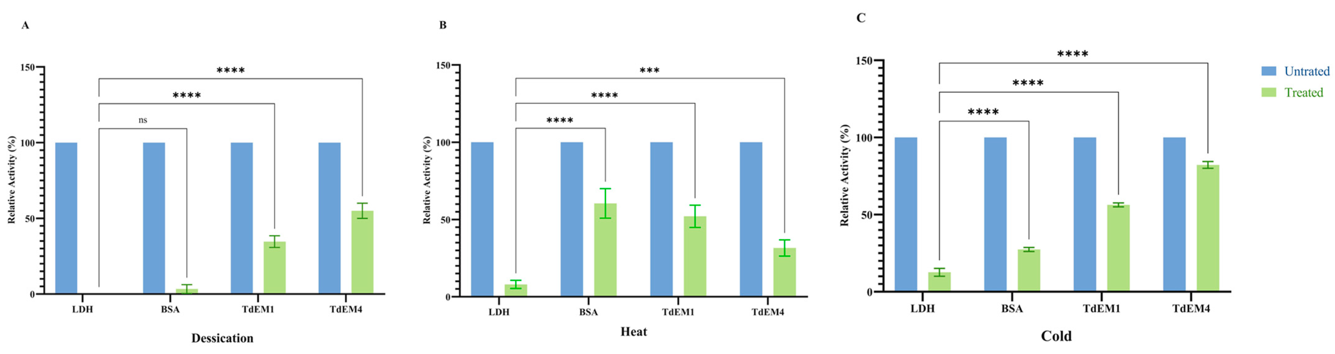 2.7. Preservation of LDH Activity Under Different Stress Treatments
