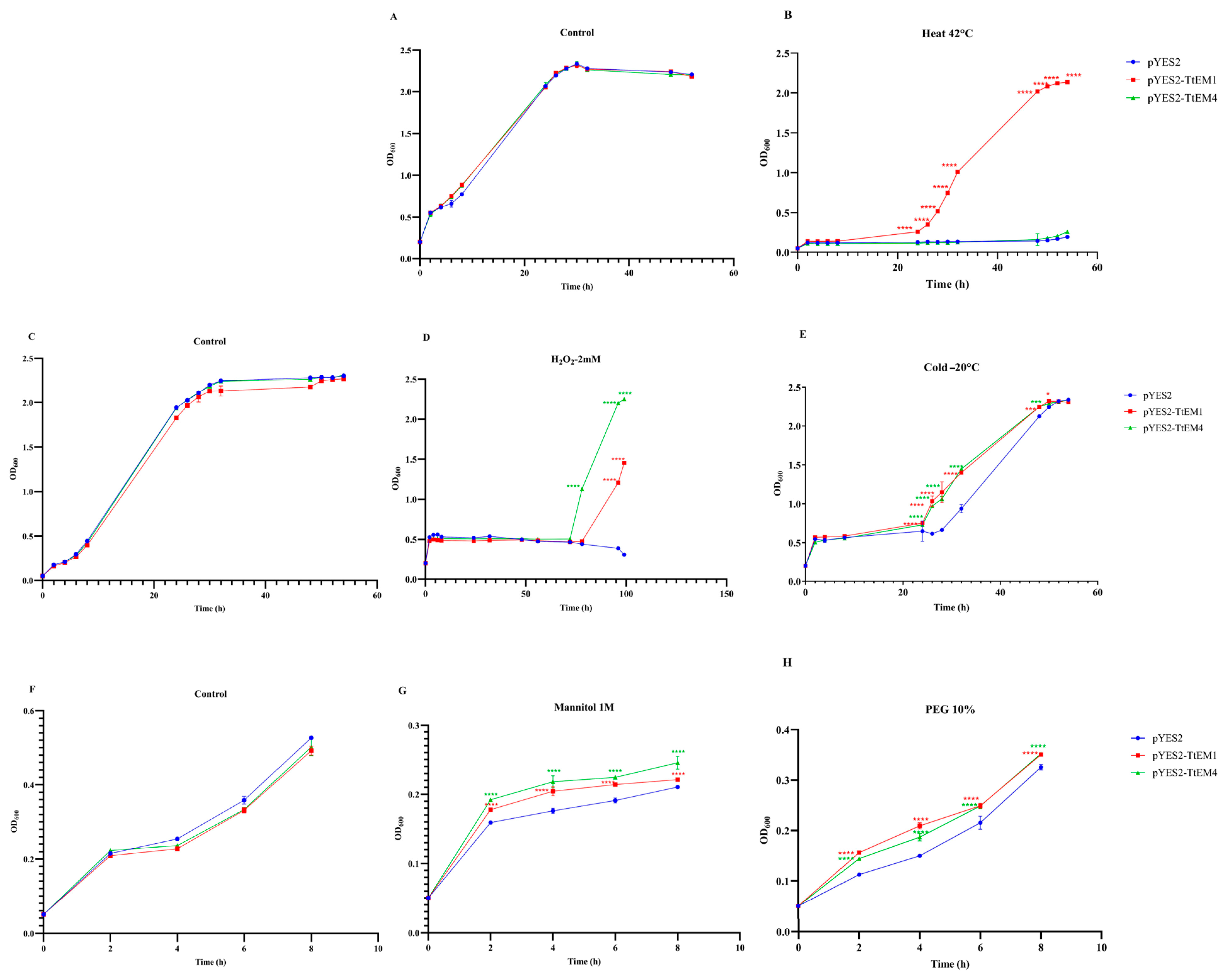 2.8. Overexpression of TtEM1 and TtEM4 Enhanced Yeast Cell Tolerance to Abiotic Stress