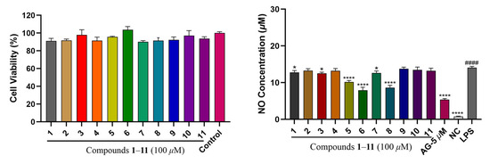 2.2. Anti-Inflammatory Activity Evaluation for Compounds 1–11
