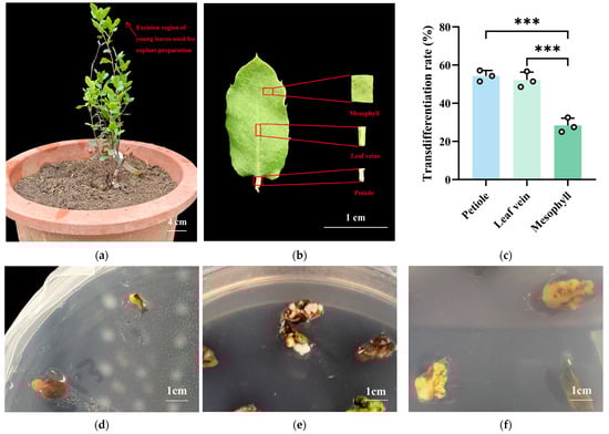 (a) Two-year-old Q. suber plant showing the excision regions of young leaves (indicated by arrows); (b) Photograph of a Q. suber leaf and schematic representation of the excised explants, including mesophyll, leaf veins, and petiole.; (c) Transdifferentiation rates of different explants (N = 45, R = 3, All data are shown as mean ± SD. *** p < 0.001); Callus formation induced by leaf veins (d), mesophyll (e), and petioles (f).