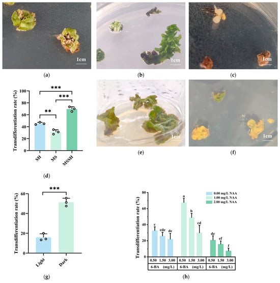 Explants were cultured under both light and dark conditions, with dark incubation significantly promoting transdifferentiation to form callus. Under light conditions, the explants primarily formed green callus (Figure 2e), with a transdifferentiation rate of 15.87%. In the dark, the explants predominantly formed yellowish-white callus (Figure 2f), with the highest transdifferentiation rate of 51.39% (Figure 2g). Therefore, the most suitable light condition for inducing transdifferentiation to form callus was darkness.