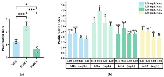 Effects of culture methods and PGRs on subculture of Q. suber: (a) Proliferation index of embryonic callus under different culture conditions: Solid medium (Solid), liquid medium with 1.00 g inoculum (Fluid 1), and liquid medium with 3.00 g inoculum (Fluid 2).; (b) Proliferation index of embryonic callus under different PGRs (Means ± SD error within a column. Different letters meant there was significant difference among groups, p < 0.05. N = 45, R = 3, * p < 0.05; *** p < 0.001).
