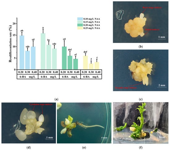 Effects of PGRs on redifferentiation of Q. suber: (a) Redifferentiation rate of embryonic callus under different plant growth regulators; (b) Global embryo and heart-stage embryo; (c) Torpedo-stage embryo; (d) Cytoledon-stage embryo; (e) The mature cotyledon-stage embryo after being transferred to light; (f) Plantlets regenerated from somatic embryos (Means ± SD error within a column. Different letters meant there was significant difference among groups, p < 0.05. N = 45, R = 3).