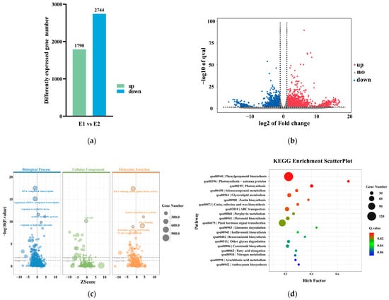 To gain a deeper understanding of the molecular mechanisms of the early stage of callus redifferentiation, we analyzed the DEGs during the early stage of callus redifferentiation (from E1 to E2). E1 samples were derived from proliferating embryogenic callus cultured on Q2 medium (MSSH liquid medium supplemented with 0.50 mg/L 6-BA and 0.20 mg/L NAA). E2 samples were obtained from globular embryos cultured on Q3 medium (MSSH solid medium supplemented with 0.15 mg/L NAA and 0.20 mg/L 6-BA). These samples represent distinct stages of early differentiation, with E1 corresponding to the early proliferative stage of callus and E2 corresponding to the early differentiation stage of somatic embryos. The results showed that 4534 genes were involved in the early stage of callus redifferentiation, with 1790 genes significantly upregulated and 2744 genes significantly downregulated (Figure 6a,b).