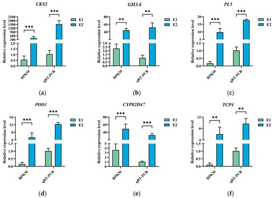 The qRT-PCR results showed high consistency with the RNA-seq data, as the expression patterns at developmental stages E1 and E2 closely matched the Reads Per Kilobase of transcript per Million mapped reads (RPKM) values from the RNA-seq analysis (Figure 8). Furthermore, a strong positive correlation was observed between the relative expression levels of the DEGs (based on 2−ΔΔCt qRT-PCR values) and their corresponding RPKM values from RNA-seq (p < 0.05).