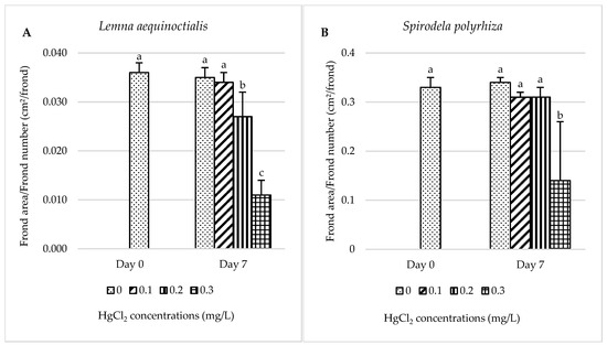 Effects of different concentrations of mercury on the frond area of L. aequinoctialis (A) and S. polyrhiza (B) at 0 and 7 days. Same letters indicate no significant differences; different letters indicate significant differences among treatments. Error bars represent standard deviation.