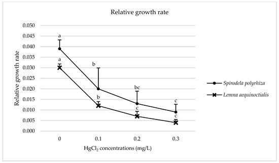Effects of different concentrations of mercury on the relative growth rate of L. aequinoctialis and S. polyrhiza on day 7. Same letters indicate no significant differences; different letters indicate significant differences among treatments. Error bars represent standard deviation.
