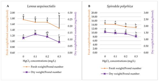 Effects of different concentrations of mercury on the fresh weight and dry weight of L. aequinoctialis (A) and S. polyrhiza (B). Same letters indicate no significant differences; different letters indicate significant differences among treatments. Error bars represent standard deviation.