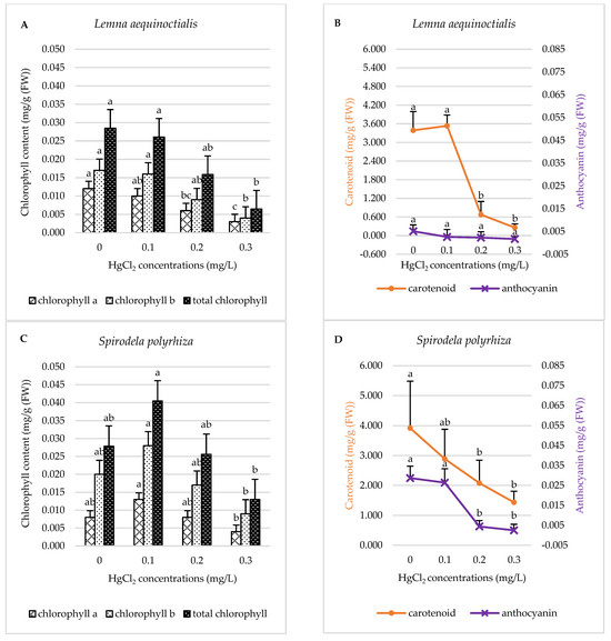 Effects of different concentrations of mercury on the content of chlorophyll a, chlorophyll b, and total chlorophyll of L. aequinoctialis (A) and S. polyrhiza (C). The content of carotenoid and anthocyanin of L. aequinoctialis (B) and S. polyrhiza (D). Same letters indicate no significant differences; different letters indicate significant differences among treatments. Error bars represent standard deviation.