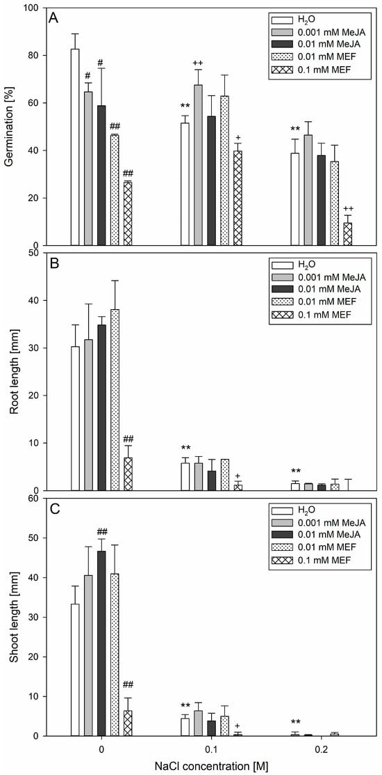 Effects of methyl jasmonate (MeJA) and mefenamic acid (MEF) on hemp seed germination and early seedling growth under salinity. Germination percentage (A), root (B), and shoot (C) length were measured on day 7 of the germination assay. Treatments included different concentrations of NaCl (0.1 M and 0.2 M), MeJA (0.001 mM and 0.01 mM), MEF (0.01 mM and 0.1 mM), and their combinations. Values represent means ± SD. Statistical significance: NaCl vs. H2O ** p ≤ 0.01; MeJA/MEF vs. H2O ## p ≤ 0.01, # p ≤ 0.05; MeJA/MEF + NaCl vs. NaCl ++ p ≤ 0.01, + p ≤ 0.05.