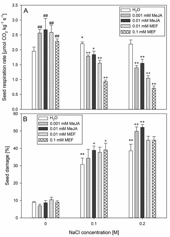 Effects of methyl jasmonate (MeJA) and mefenamic acid (MEF) on hemp seed respiration rate (A) and seed damage percentage (B) under salt stress. Seeds for the measurements were collected 24 h after incubation in NaCl (0.1 M and 0.2 M), MeJA (0.001 mM and 0.01 mM), or MEF (0.01 mM and 0.1 mM), and their mixtures. Values represent means ± SD. Statistical significance: NaCl vs. H2O ** p ≤ 0.01, * p ≤ 0.05; MeJA/MEF vs. H2O ## p ≤ 0.01; MeJA/MEF + NaCl vs. NaCl ++ p ≤ 0.01, + p ≤ 0.05.