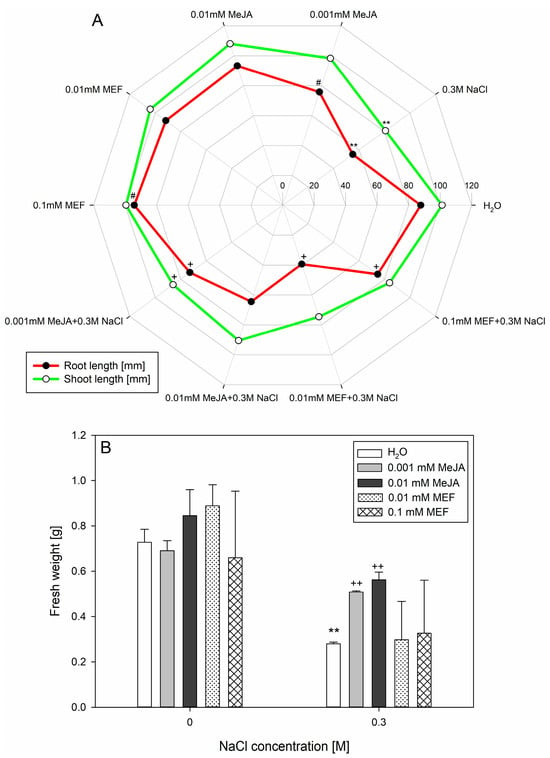 Effects of methyl jasmonate (MeJA) and mefenamic acid (MEF) on root and shoot length (A) and fresh weight (B) of 25-day-old hemp cultivated under salt stress conditions. Treatments included NaCl (0.3 M), MeJA (0.001 mM and 0.01 mM), MEF (0.01 mM and 0.1 mM), and their combinations. Values represent means ± SD. Statistical significance: NaCl vs. H2O ** p ≤ 0.01; MeJA/MEF vs. H2O # p ≤ 0.05; MeJA/MEF + NaCl vs. NaCl ++ p ≤ 0.01, + p ≤ 0.05.