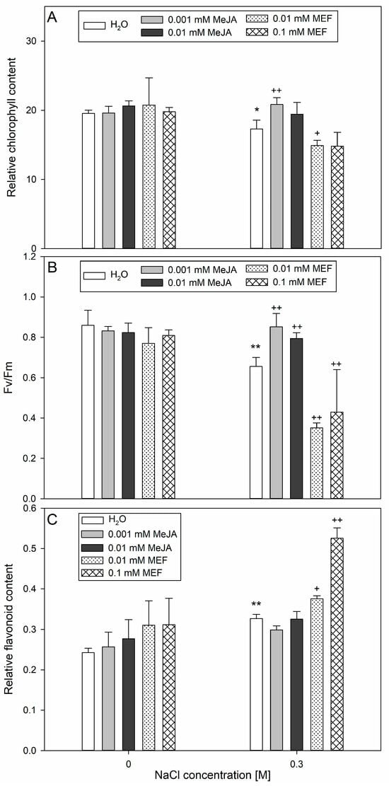 Effects of methyl jasmonate (MeJA) and mefenamic acid (MEF) on total chlorophyll content (A), Fv/Fm (B), and flavonoid level (C) in leaves of 25-day-old hemp subjected to salt stress. Treatments included NaCl (0.3 M), MeJA (0.001 mM and 0.01 mM), MEF (0.01 mM and 0.1 mM), and their combinations. Values represent means ± SD. Statistical significance: NaCl vs. H2O ** p ≤ 0.01, * p ≤ 0.05; MeJA/MEF + NaCl vs. NaCl ++ p ≤ 0.01, + p ≤ 0.05.