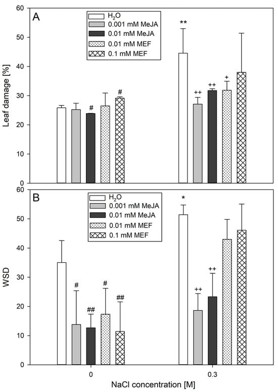Effects of methyl jasmonate (MeJA) and mefenamic acid (MEF) on leaf damage (A) and WSD (B) in 25-day-old plants subjected to salt stress. Treatments included NaCl (0.3 M), MeJA (0.001 mM and 0.01 mM), MEF (0.01 mM and 0.1 mM), and their combinations. Values represent means ± SD. Statistical significance: NaCl vs. H2O ** p ≤ 0.01, * p ≤ 0.05; MeJA/MEF vs. H2O ## p ≤ 0.01, # p ≤ 0.05; MeJA/MEF + NaCl vs. NaCl ++ p ≤ 0.01, + p ≤ 0.05.